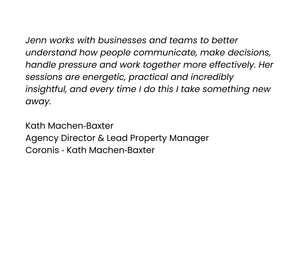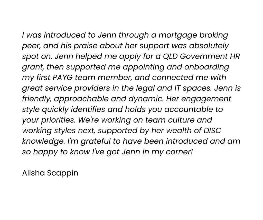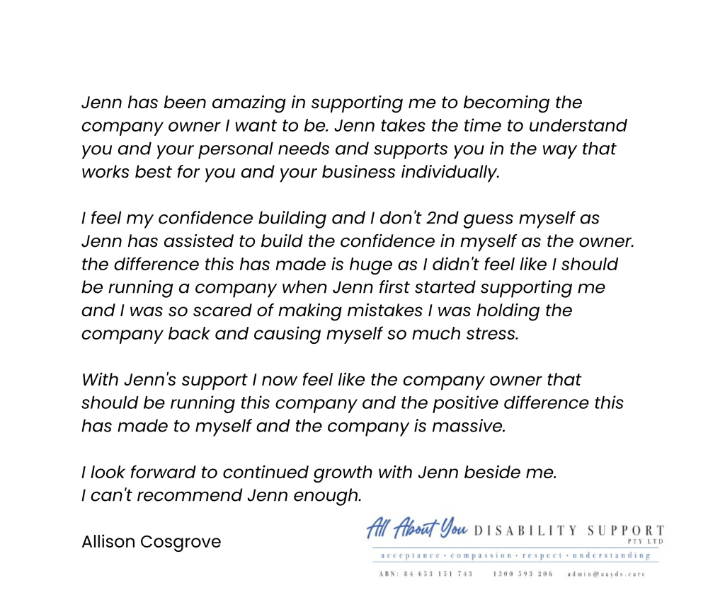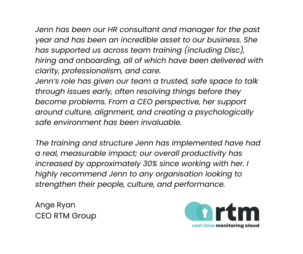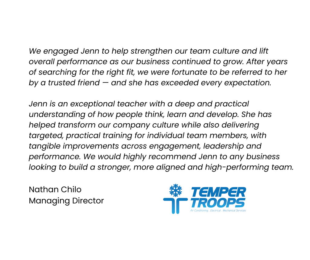 Leadership growth isn’t always comfortable, especially as responsibilities increase and expectations shift. Working alongside Jenn Wallace Consulting means having a trusted partner who supports you through the tough conversations, offers clear and honest perspective when direction needs adjusting, and recognises progress as leadership capability and confidence grow.